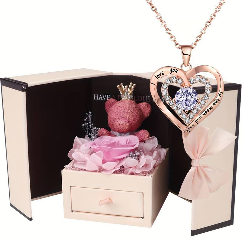 Širdelės formos pakabukas prabangiai papuoštoje dėžutėje su meškučiu ir rože.