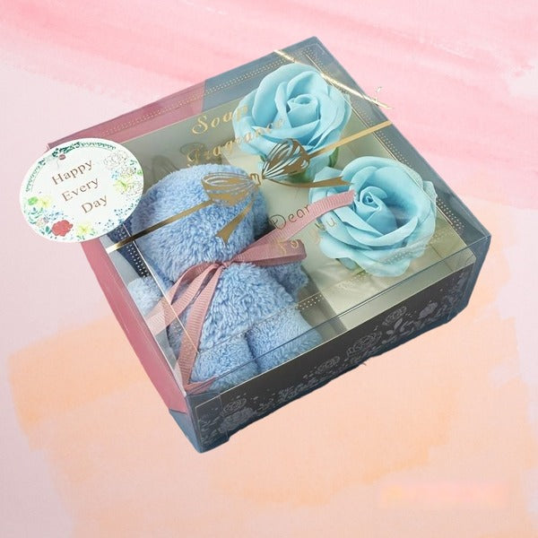 Komplektukas su rankšluoščiu ir kvepiančiomis muilo rožytėmis.