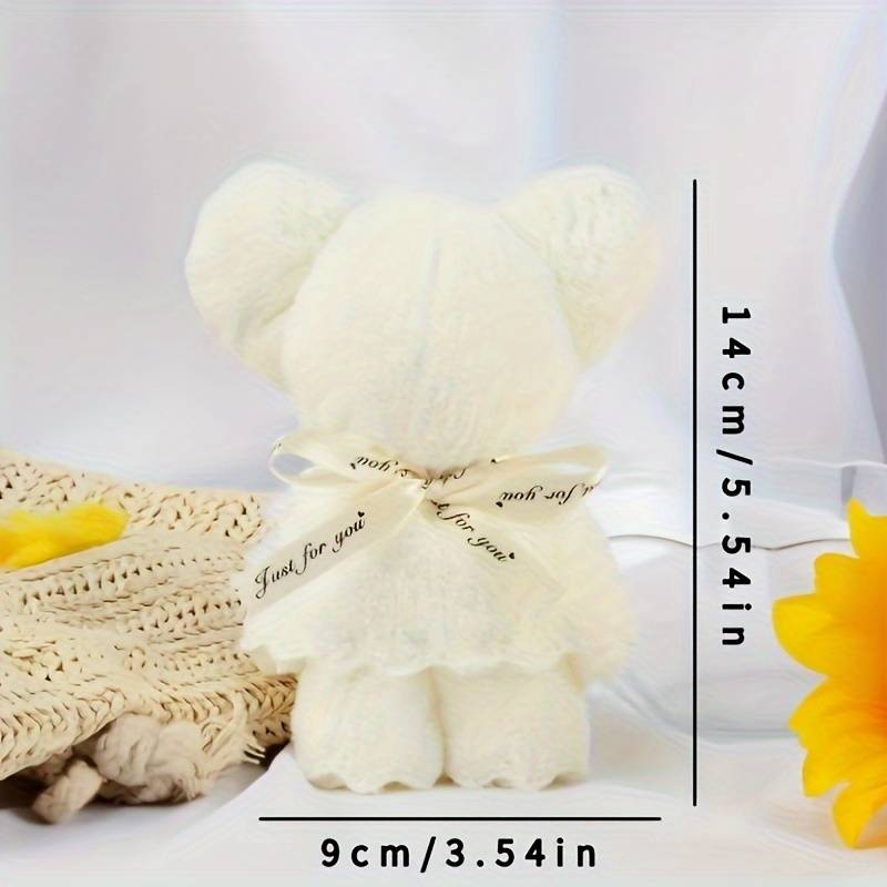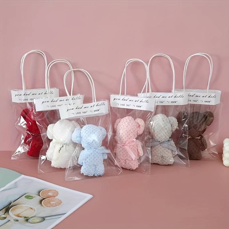 Rankšluostukas sulankstytas į meškiuko formą, parduodamas pavaizduotoje pakuotėje.