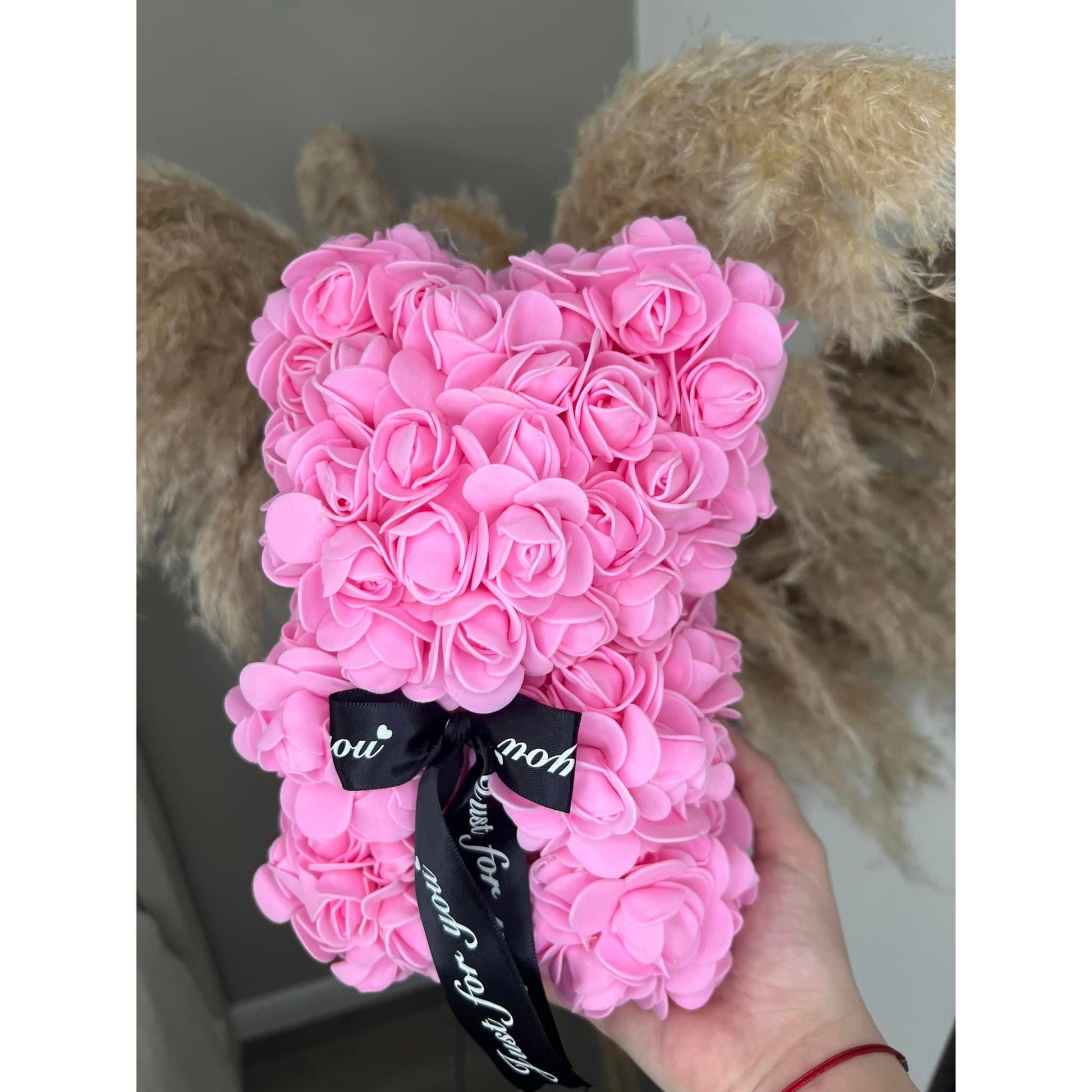 Rožių meškiukas su kaspinėliu. Rožinė spalva, aukštis - 25cm.